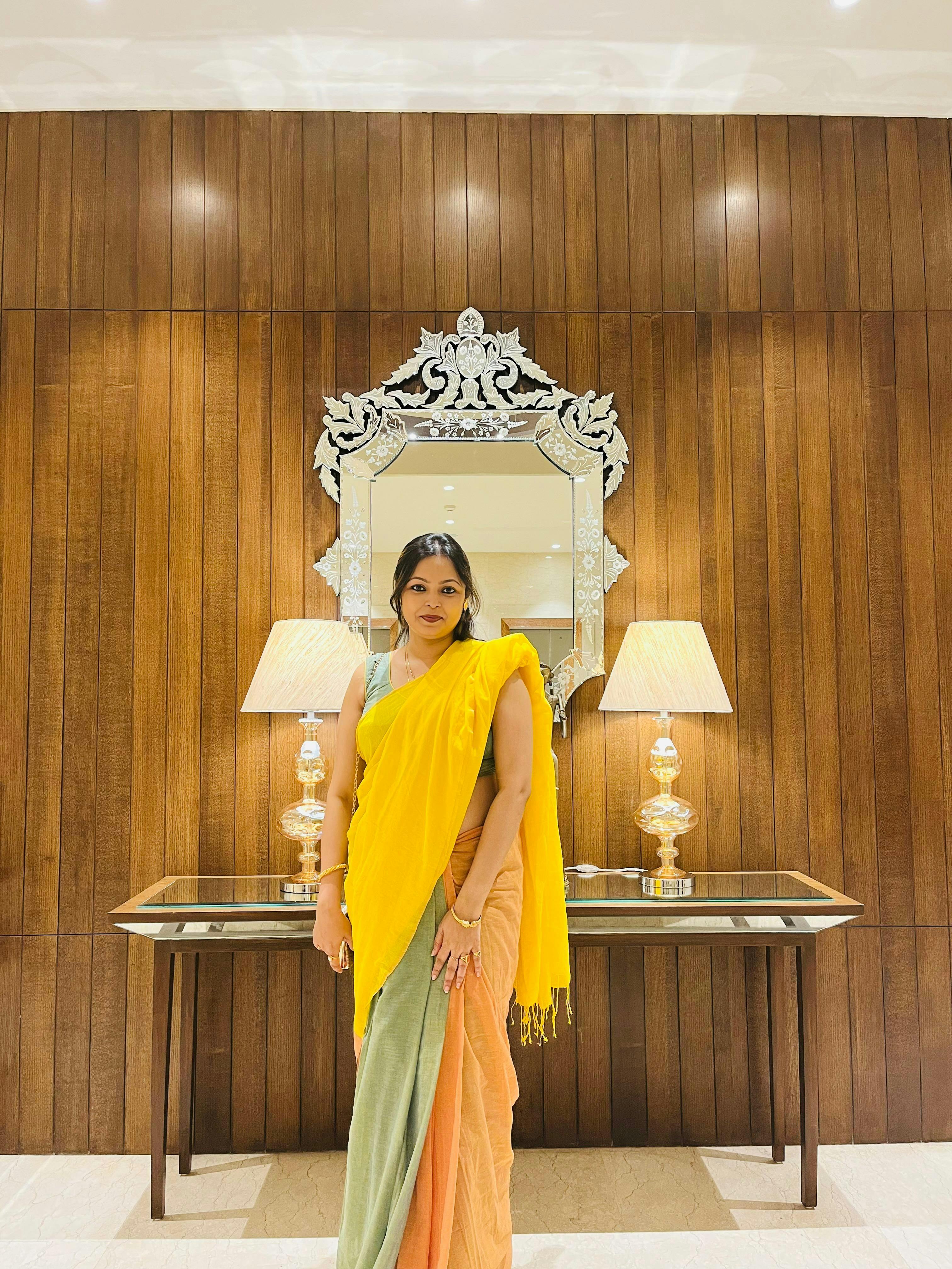 Handloom woven, lightweight, cotton sarees in pop colorblock aesthetic, embellished with thin gold tested zari.