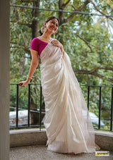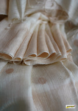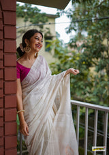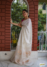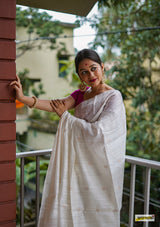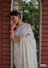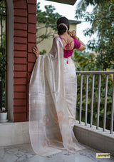 Handwoven pure matka silk saree, adorned with jamdani woven gold zari butas and motifs on palla.