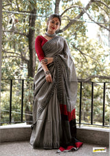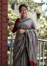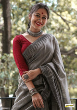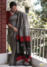 Handwoven pure matka jamdani silk saree, adorned with resham woven temple and motifs on palla.