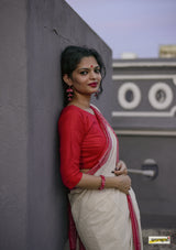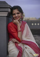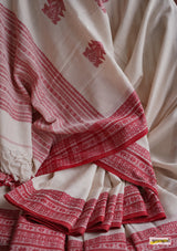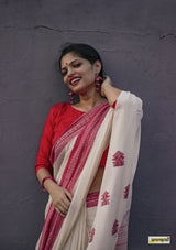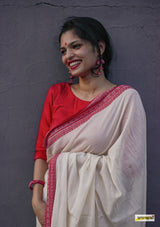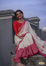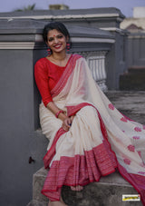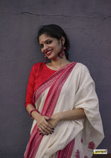 Handwoven pure mercerised cotton saree, adorned with Manipuri patterned threadwork.