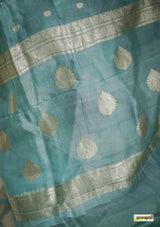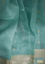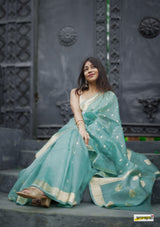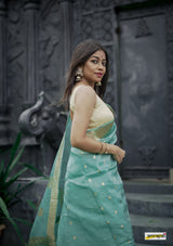 Indulge in the handwoven, timeless grace of organza silk banarasi, embellished with delicate golden zari floral butas and intricately woven palla, edged with a detailed zari border.