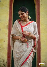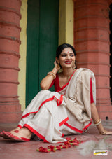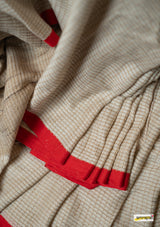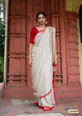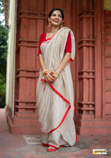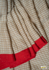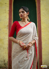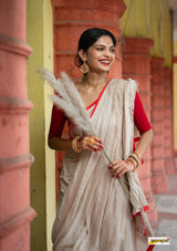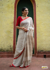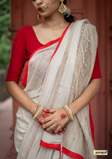 Soft, handloom-woven, handspun cotton ghicha katia saree with textured pattern adorned with tassels.