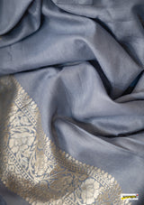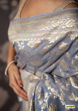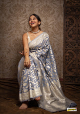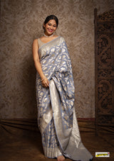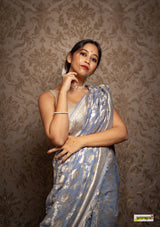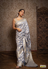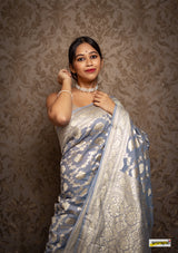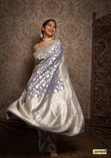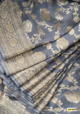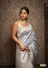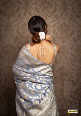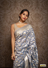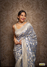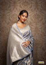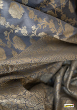 Kataan (pure silk) muga jaal benarasi saree, embellished with pastel gold zari border(25gms. of real silver) and floral cutwork detailing all across.