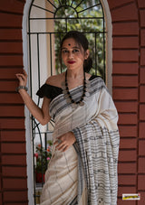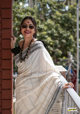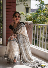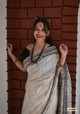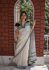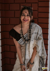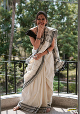 Handwoven pure kala cotton bhujodi saree, adorned with braided hem and fringed tassles.