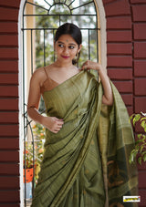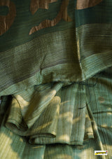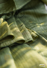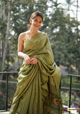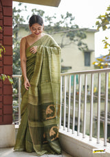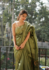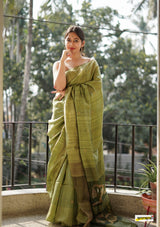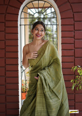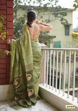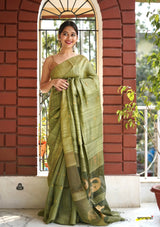 Handwoven pure matka jamdani silk saree, adorned with zari woven gold butas and motifs on palla.