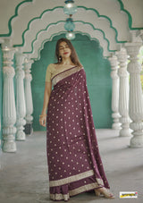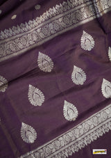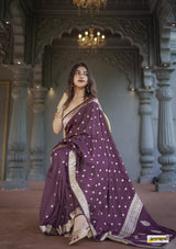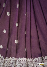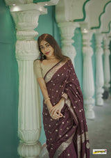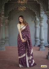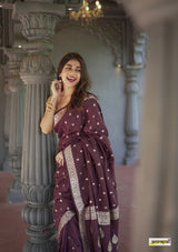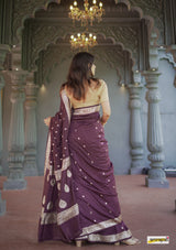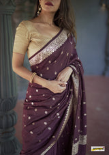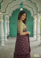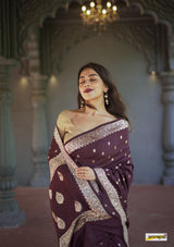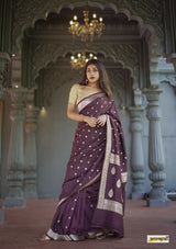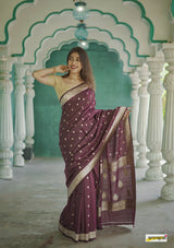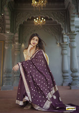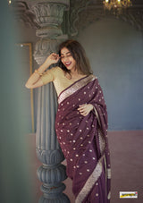 Embrace the handwoven timeless luxury of muga silk banarasi, embellished with delicate golden zari floral butas and intricately woven palla, edged with a detailed zari border.