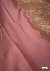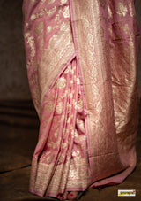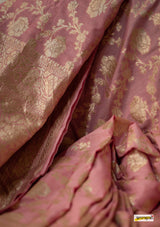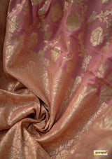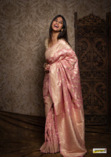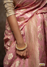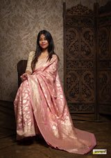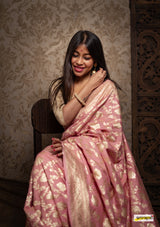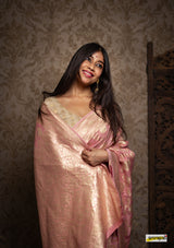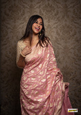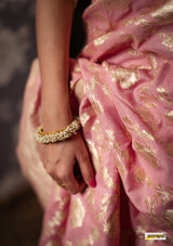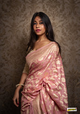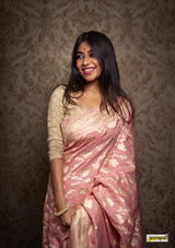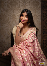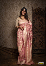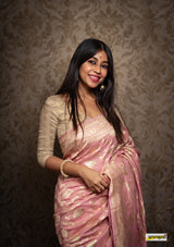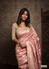 Kataan (pure silk) muga jaal benarasi saree, embellished with pastel gold zari border(25gms. of real silver) and floral cutwork detailing all across.