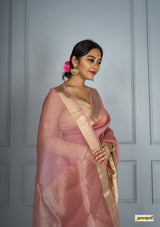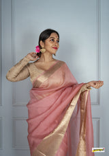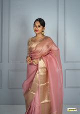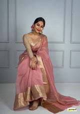 Handloom woven, sheer, lightweight, pure silk organza benarasi, embellished with kadhua woven gold zari border and palla in a blend of silk and tissue. Blouse piece comes in a fabric of organza by spun silk, in plain solid color of the saree.