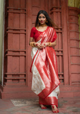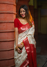 Powerloom woven, kataan chiniya silk benarasi with gold tested zari border, embellished with floral gold zari cutwork motifs on body, heavily embellished palla and a stunning red and gold blouse piece.