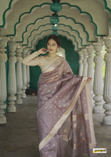 Indulge in the handwoven, timeless grace of organza silk banarasi, embellished with delicate golden zari floral butas and intricately woven palla, edged with a detailed zari border.