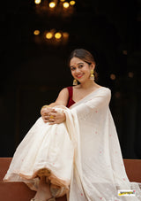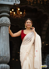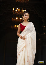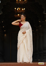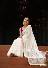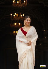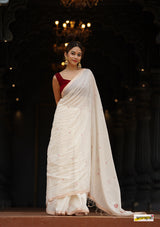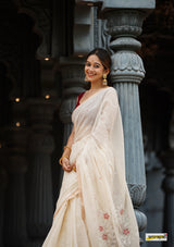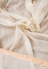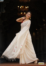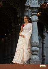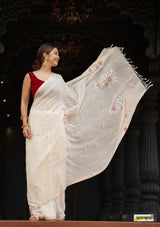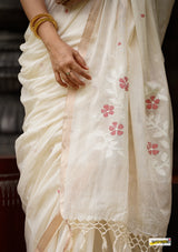 Soft, handloom woven, handspun fine cotton saree, adorned with tiny flowers across the body and palla woven in a jamdani technique, embellished with tassles.