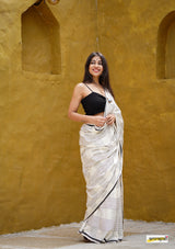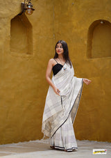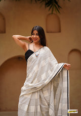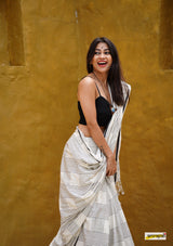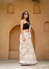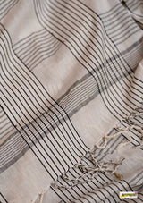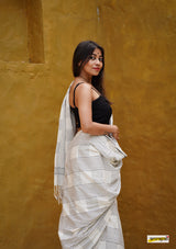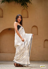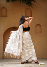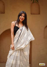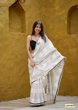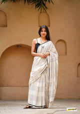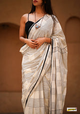 Handloom woven, pure cotton saree, designed in a contemporary style of checks and stripes embellished with tassles.