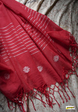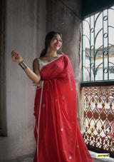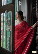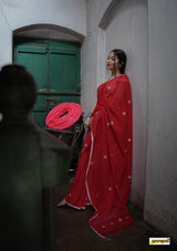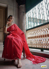 Buttery soft, handloom woven, semi-translucent cotton saree, adorned with 'jamdani inspired' jacquard butas and braided tassles.