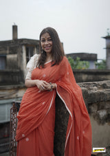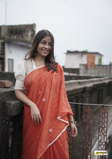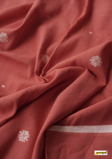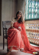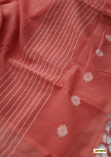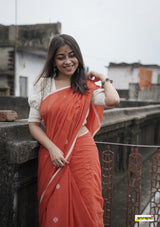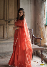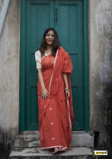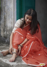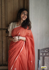 Buttery soft, handloom woven, semi-translucent cotton saree, adorned with 'jamdani inspired' jacquard butas and braided tassles.