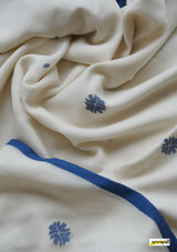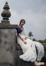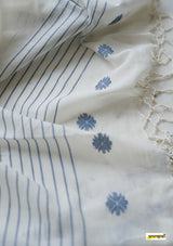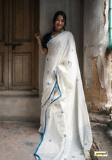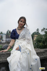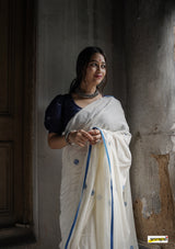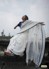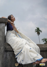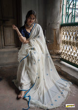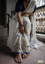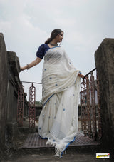 Buttery soft, handloom woven, semi-translucent cotton saree, adorned with 'jamdani inspired' jacquard butas and braided tassles.